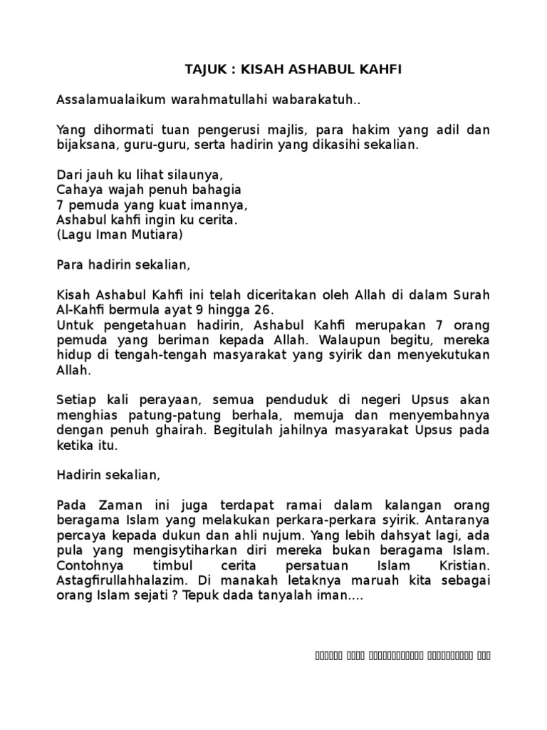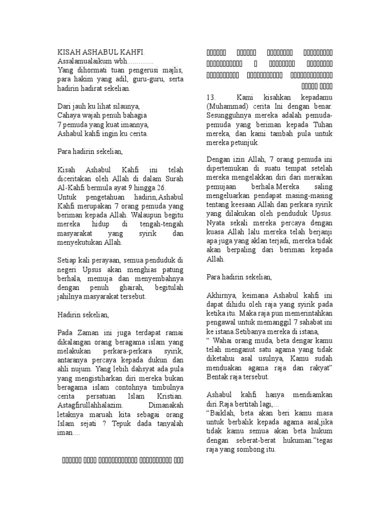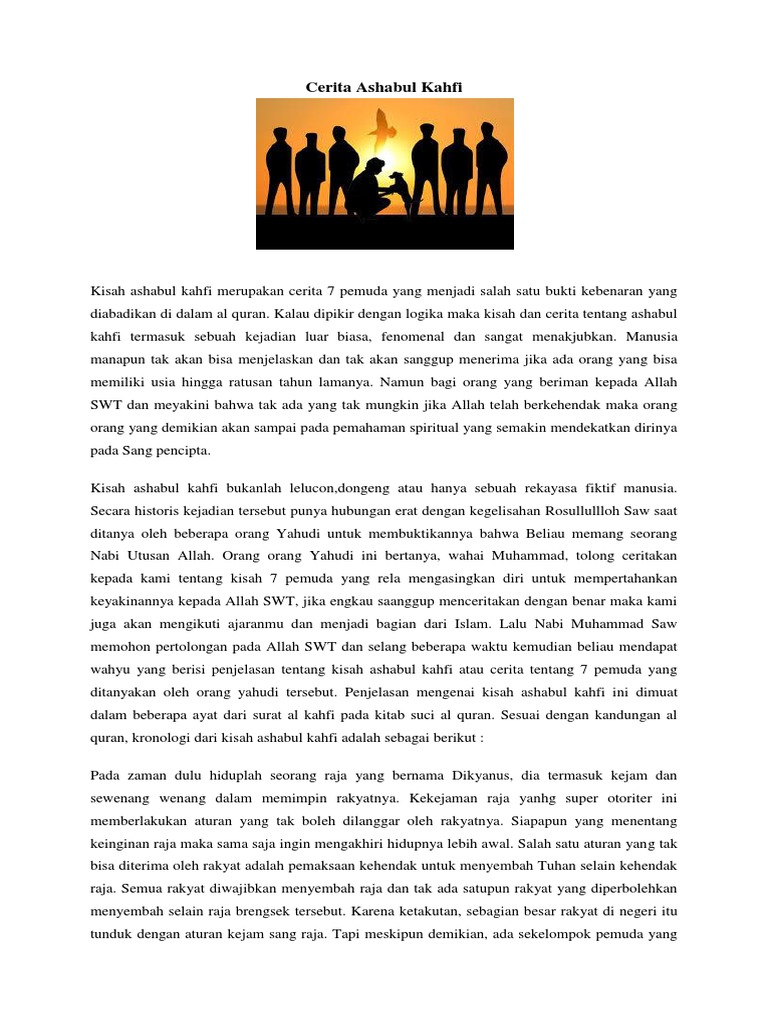 Teks Bercerita Ashabul Kahfi from imgv2-1-f.scribdassets.com Kisah ashabul kahfi mendapat perhatian lebih dengan digunakan sebagai nama surat dimana terdapat tiga kisah tersebut. Cerita dzulkarnain dengan ya'juj dan ma'juj. Cerita ini mengkisahkan beberapa penghuni gua yang mengandung i'tibar dan pelajaran yang amat berguna bagi kehidupan manusia. Mereka adalah tujuh pemuda yang beriman kepada allah dan lari dari kekejaman raja dzalim. Cerita ashabul kahfi (the seven sleepers) bermula dari tujuh pemuda yang hidup di masa raja dikyanus, raja romawi kuno yang terkenal diktator dan otoriter. Nah bagi anda yang ingin membaca surat ini secara online, disini saya sajikan teks bacaan surat al kahfi arab latin. Dalam ceritanya, menceritakan tentang sekelompok pemuda yang beriman kepada allah swt. In his work entitled ashabul kahfi;
